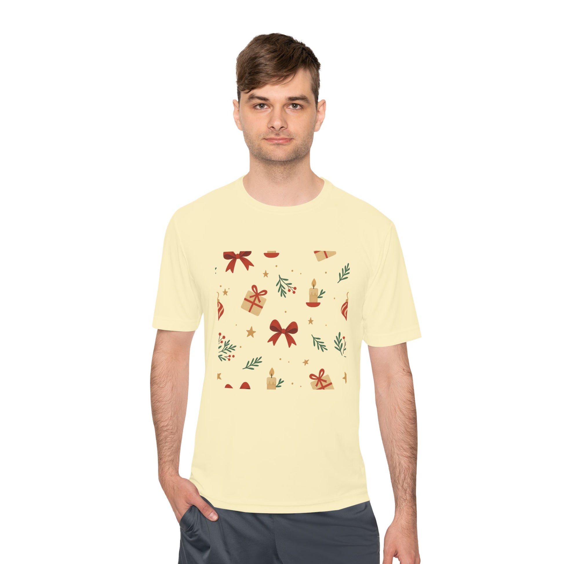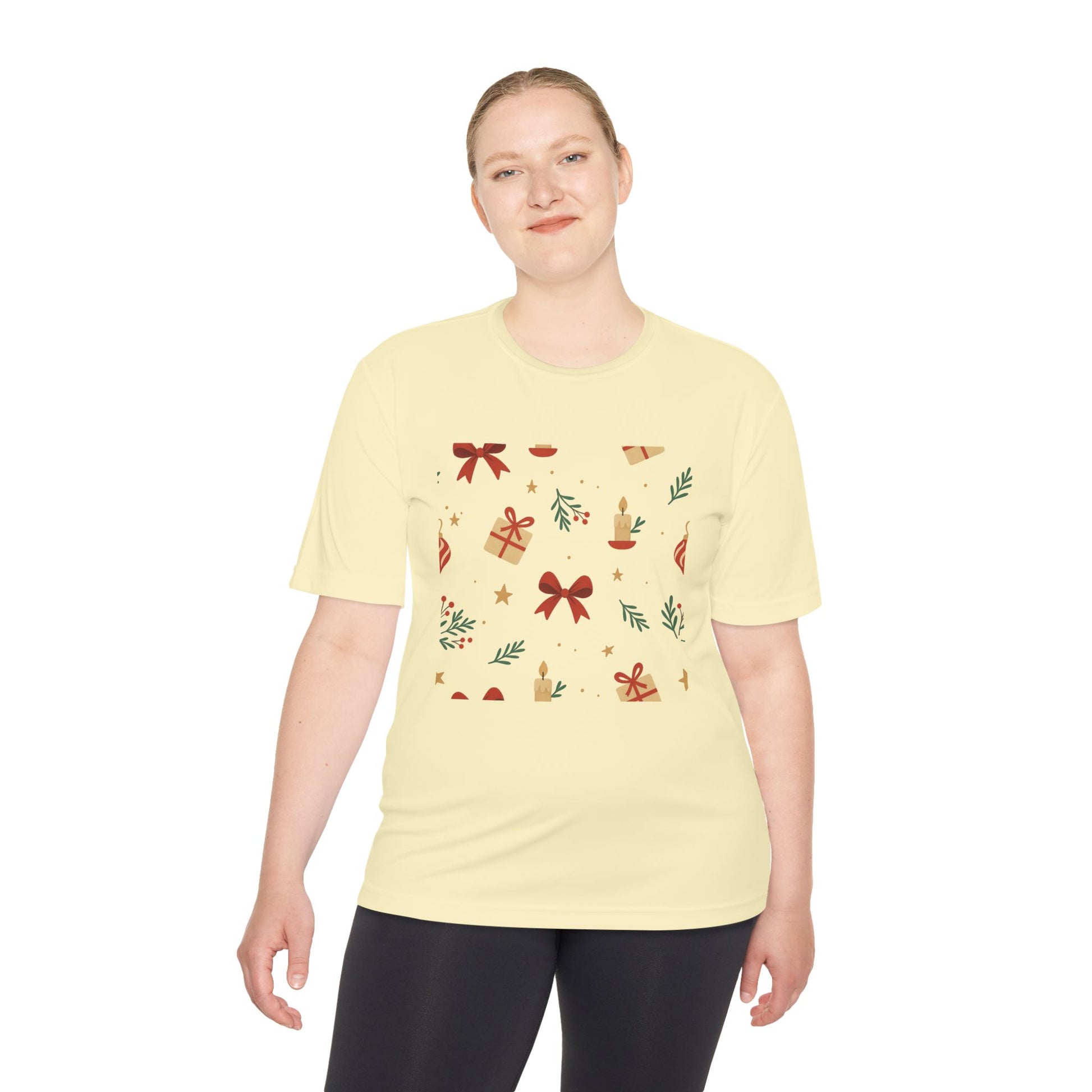 A lightweight, moisture-wicking tee with a festive holiday print that feels airy and effortless. The extra-light 100% polyester fabric keeps you cool and moves with you, while the DTF-printed seasonal icons — bows, candles, gifts, and sprigs of greenery — add a warm, handmade touch to a clean, modern silhouette. Double-stitched hems and side seams give structure so it holds up wash after wash. Wear it layered under a cardigan for a cozy family gathering, or on its own during busy holiday errands when you want comfort without the bulk. The tear-away label and soft self-fabric collar make it comfortable against skin, so the focus stays on the little festive details that brighten the day.