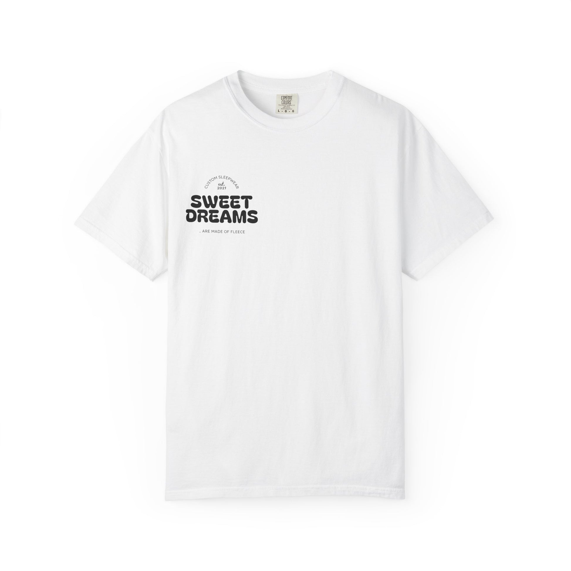 A relaxed, garment-dyed cotton tee that reads like a quiet promise: small chest print that says “SWEET DREAMS,” a soft, lived-in hand, and a roomy cut made to be reached for at bedtime or worn out for slow mornings. The heavyweight 100% ring-spun cotton becomes more comfortable with every wash, while tubular construction and double-needle stitching keep the silhouette clean and durable. It sits lightly on the shoulders and lets the tiny, understated artwork do the talking — calm, nostalgic, and familiar. Wear it for late-night reading, porch coffee, or to wind down after a long day; it’s the kind of tee that slips into your routine and feels like part of the furniture.